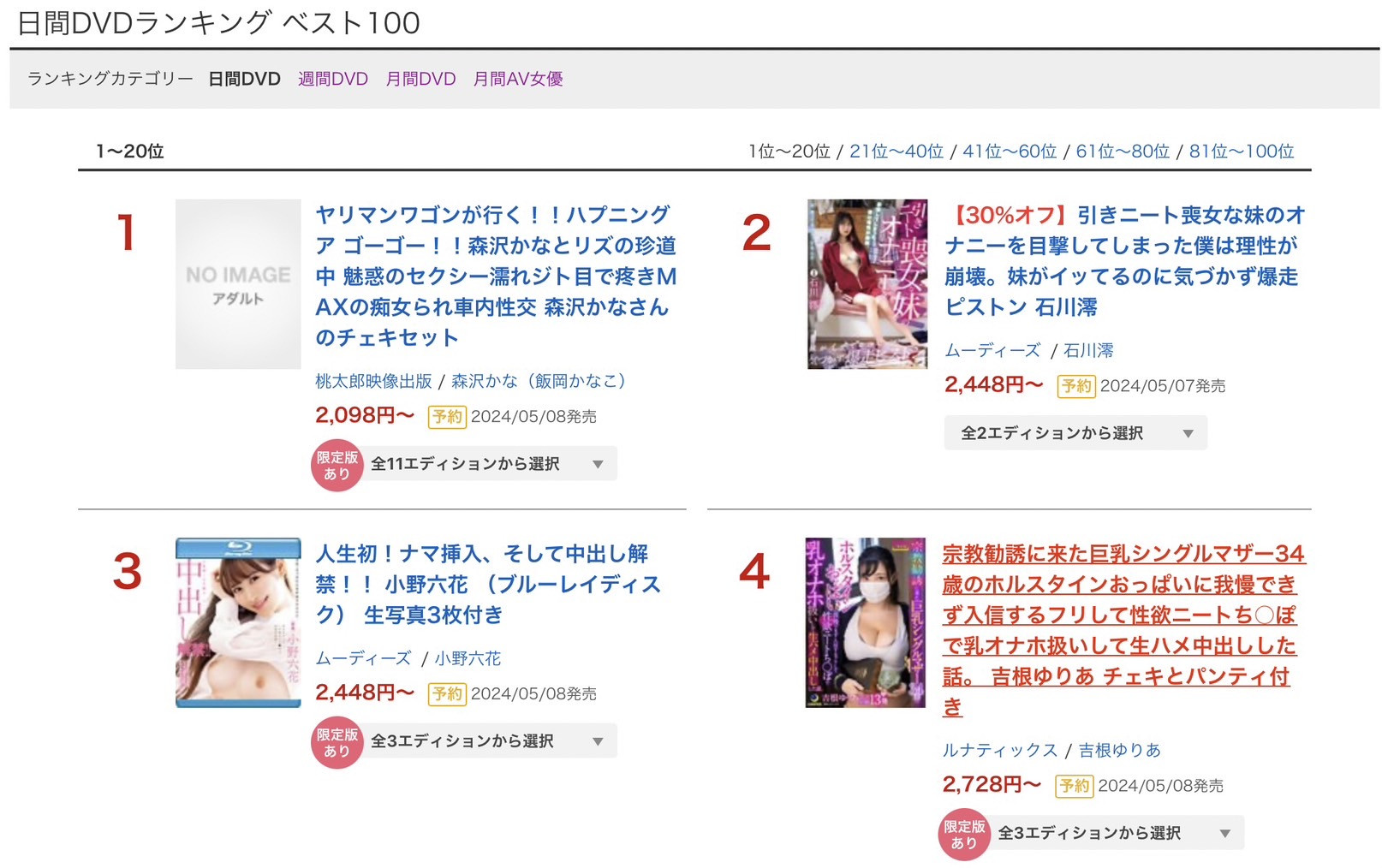 剧情简介:这是昨天FANZA的销售排行榜。第一名是还没有封面的「ヤリマンワゴンが行く!!ハプニングアゴーゴー!!森沢かなとリズの珍道中魅惑のセクシー濡れジト目で疼きMAX